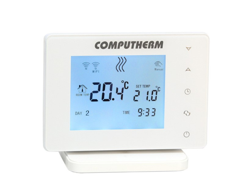 A COMPUTHERM E400RF Wi-Fi termosztát egy interneten keresztül okostelefonról és tabletről is vezérelhető, érintőgombos, vezeték nélküli kapcsolóüzemű készülék, melyet elsősorban fűtési illetve hűtési rendszerek vezérlésére ajánlunk. Egyszerűen csatlakoztatható bármely, kétvezetékes szobatermosztát csatlakozási ponttal rendelkező gázkazánhoz, továbbá tetszőleges klímaberendezéshez vagy egyéb elektromos készülékhez függetlenül attól, hogy azok 24 V-os vagy 230 V-os vezérlőáramkörrel rendelkeznek.
