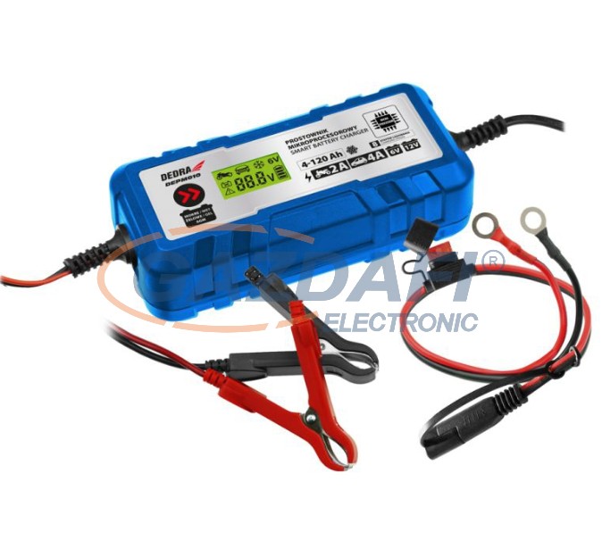 DEDRA DEPM010 Akkumulátor töltő 6/12V, 4-120Ah, 2A/4A, LCD