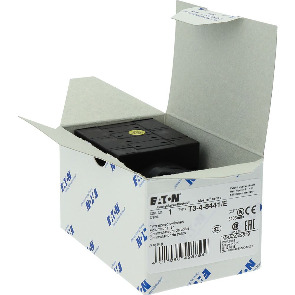 Gyártó EATONAnyag MűanyagÁramerősség 32AGyártói cikkszám 042879Típus T3-4-8441/EVonalkód / EAN-kód 4015080428794Modell - EF000010 Dahlander kapcsoló (Dahlander switch)Névleges üzemelési teljesítmény AC-3-ra, 400 V esetén - EF001364 12Névleges állandó áram Iu - EF001389 32pólusok száma - EF001391 3Névleges üzemi áram Ie AC-3-on, 400 V-nál - EF001392 23.7Zéró (kikapcsolt) pozíció - EF001416 IgenHáz anyaga - EF001596 Műanyag (Plastic)Visszahúzva az 0. pozícióban - EF002428 NemVédettségi fokozat (IP), elülső oldal - EF003118 IP65Váltókapcsolóként alkalmazott segédérintkezők száma - EF003531 0Fő áramkör elektromos csatlakozásának típusa - EF006819 Csavaros csatlakozás (Screw connection)Irányító elem típusa - EF006976 Rövid forgó fogantyú (Short rotary handle)EF007243 NemEF007246 IgenElosztószekrénybe szereléshez megfelelő - EF007262 NemKöztes szereléshez alkalmas - EF007264 NemKészülék házban - EF007317 NemVédettségi fokozat (NEMA), elülső oldal - EF011961 12Segédérintkezők száma, nyitó 0Segédérintkezők száma, záró 0Gyártó EatonCikkszám 042879