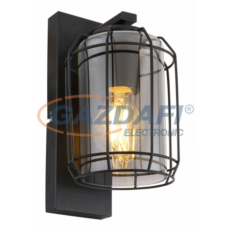 Falikar fém fekete alaplap, füstszínű üveg búra, fém rácskeretben. SzxM:130x250, AL:165, fényforrás nélkül 1xE27 60W 230V
