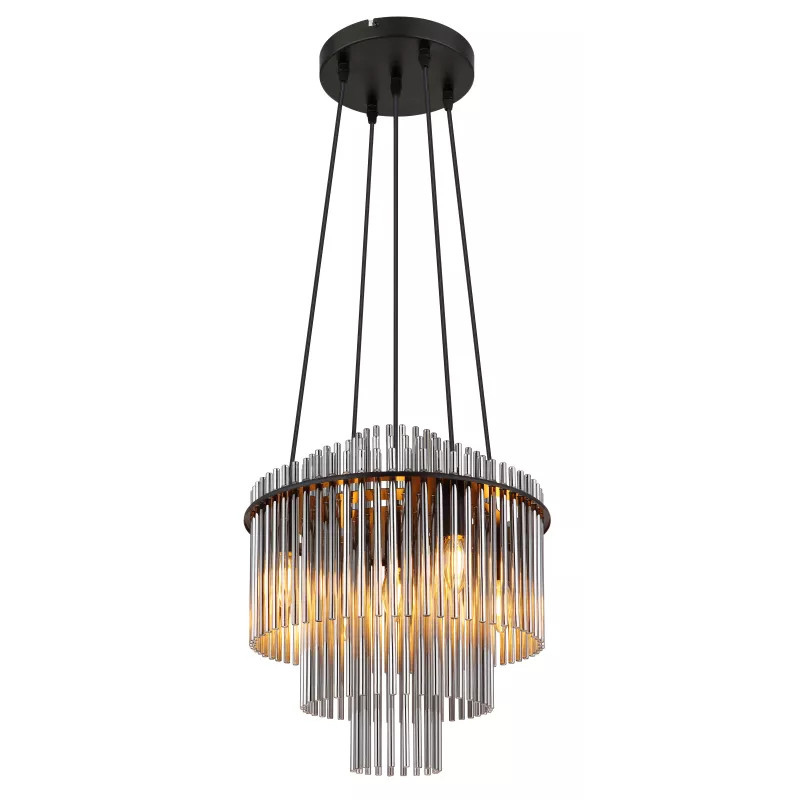 Függőlámpa, fém fekete matt, füstszínű üvegrudak, kábel PVC fekete, magasság rövidíthető, ø: 400mm, M: 1200mm, 5x E14 40W 230V izzók nélkül