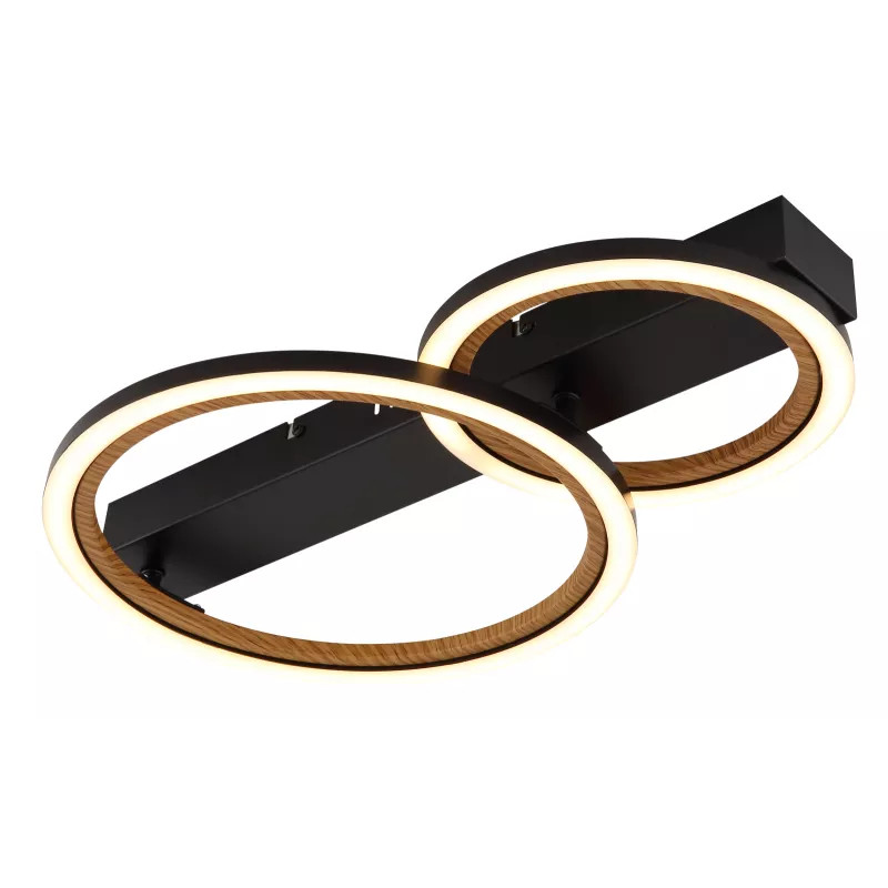 Mennyezeti lámpa, matt fekete fém, matt fekete ABS, sötét fa megjelenésű alumínium, fehér műanyag, HxSzxM: 440x300x70mm, gyűrűk ø: 1 x 20,5 cm és 30 cm, tartozék: LED 30W 230V, 3000K