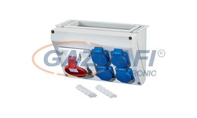 - Csatlakozódoboz 2-es oldalfal kivágáshoz, zsanéros beépítési felület, 1x16A 5p, 4x16A 2p+E csatlakozóaljzatokkal, IP44