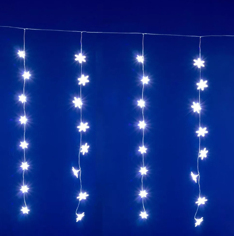 A fényfüggöny különlegessége a 50 darab 7 cm-es hópehely, amelyek mindegyike hidegfehér LED-del világít, így a fényhatás friss, havas ragyogást idéz.