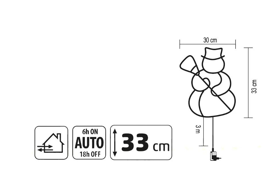 Központi eleme egy mosolygós hóember forma, amelyet 35 db melegfehér LED világít meg. A fehér vezetékdiszkréten simul a környezetébe. Kültéri és beltéri használatra egyaránt alkalmas, így ablakon, teraszajtón vagy belső térben is elhelyezhető.