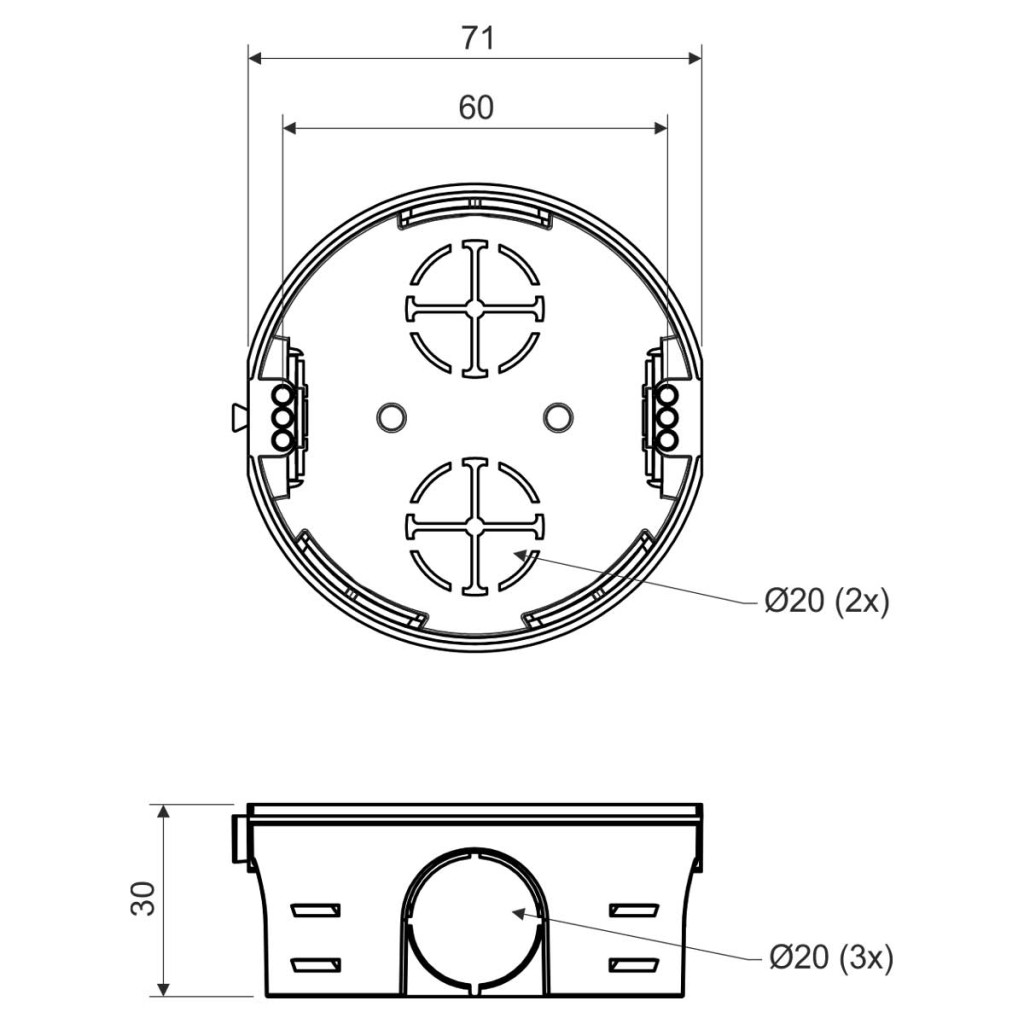 KP 68/2 - Box instrumental, configuration KA, colour grey, package - 150 pcs - possibility of connection in a continuous row with a pitch of 71 mm, it is recommended to connect up to 3 boxes in one row, boxes can be connected with boxes KU 68-1901, KP 68/2 and KPR 68, allows installation of wiring in thin partitions