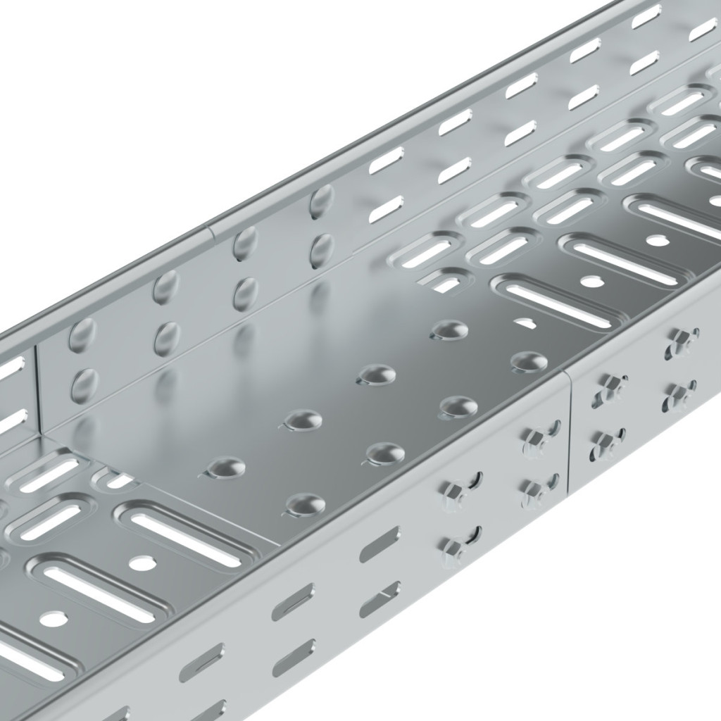 Coupling for cable trays meant for standard routes with maintained functionality in fire, for cable trays with dimension 60x75 mm. Surface treatment Magnelis®.