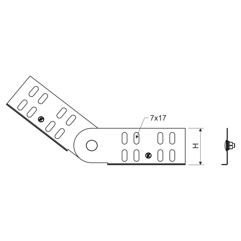 Hinged join for connection of 2 cable trays with the height of sideboard 85 mm at the adjustable angle in the horizontal direction. ZM surface finish (galvanizing Zn+Al+Mg) is intended for products with ZM surface finish or hot-dip galvanized products.
