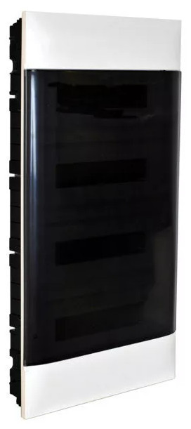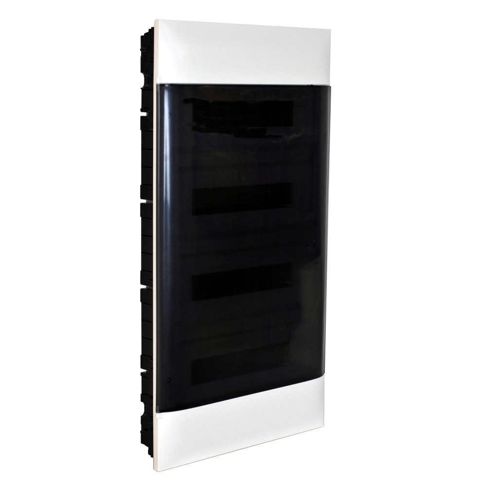 LEGRAND 137159 PractiboxS téglafalba süllyeszthető kiselosztó(650°C), átlátszó füstszínű ajtóval, védőföld és nulla elosztókapoccsal, 4 sor 18 modul