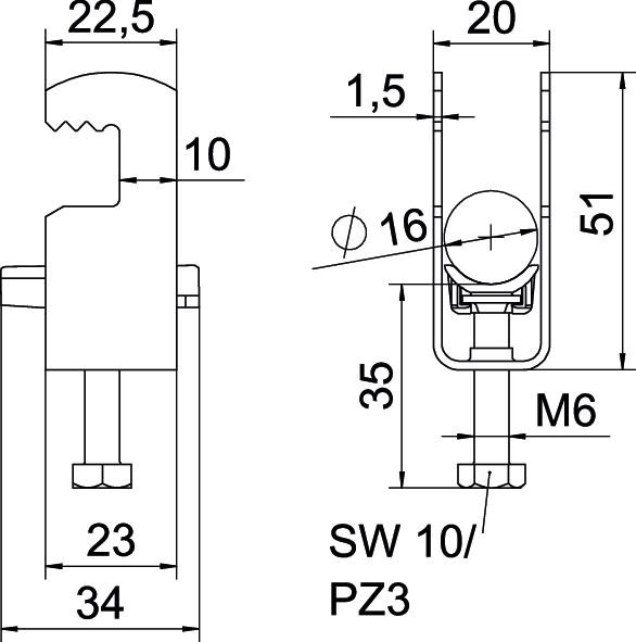 Kengyeles bilincs F-kivitel, polipropilén műanyag nyomóvályúval. Függőleges és vízszintes szereléshez 1 kábel részére, laposvashoz. Egymenetes csavar a nyomóvályún, univerzális hatlapfejű csavarfej SW10/PZ3 kereszthoronnyal. Kültéri és beltéri szereléshez alkalmas. Ellendarab használata ajánlott. 4-12 mm anyagvastagsághoz.