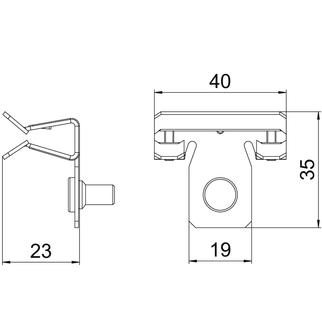 Support clamp with M6 threaded bolt at side for individual mounting solutions. Fastening through knocking onto steel girders.