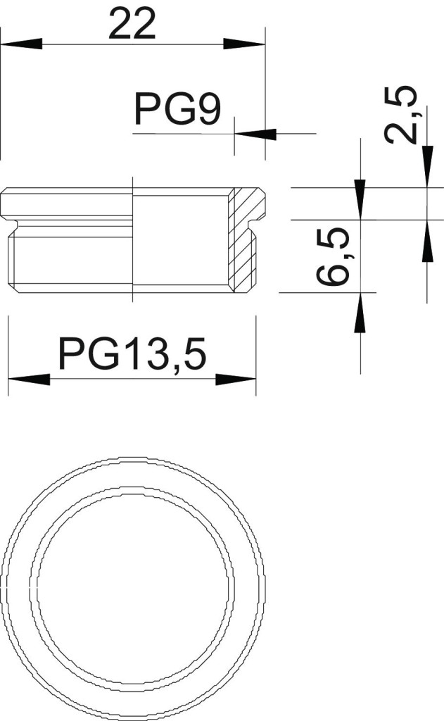 DIN 46320 szerinti szűkítőelem (H alkatrész), DIN 40430 szerinti páncélmenettel, közbenső elemként egy páncélmenetes furattól egy kisebb tömszelencére.