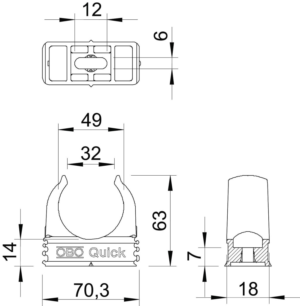 OBO Quick rögzítőbilincs típus 2955/...: az összes metrikus acélpáncélcsőhöz, valamint könnyű és nehéz metrikus szigetelő csövekhez. Alkalmas az OBO Quick-Pipe védőcsővek felszereléséhez. A csőbilincsen található jelölés lehetővé teszi a cső optimális pozícionálását, és így a bilincs elfordítható a megfelelő helyzetbe. OBO Multi-Quick és starQuick bilinccsel együtt is alkalmazható. Facsavarral vagy beütő tiplivel történő szerelésnél hosszanti furat az oldalirányú pozícionáláshoz. M16-M32 méret felcsavarozható M6 menetre. Ajánlott rögzítési távolság 50-60 cm, a max. kihúzási értékeket (F) 20 °C szobahőmérsékleten lásd a táblázatban.