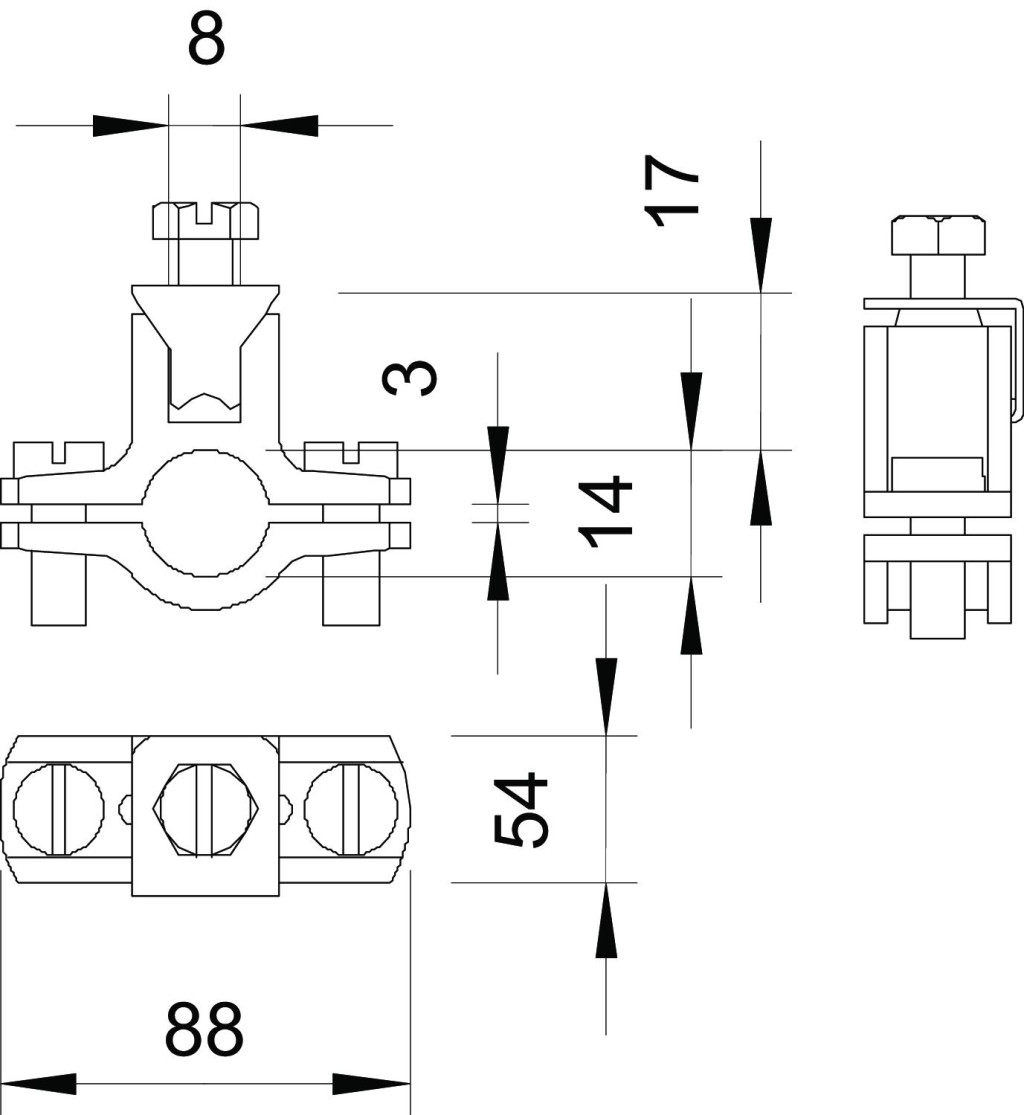 • Elveszíthetetlen nyomóléccel, 2 db M6 x 16 és 1 db M6 x 16 hengeres fejű galvánhorganyzott acél csavarral, bilincs-felsőrész és -alsórész cink-présöntvényből
