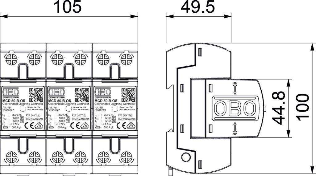 OBO 5096835 MCD 50-B 3-OS Coordinatedlightningcontroller Készlet állapotjelzéssel, 255V