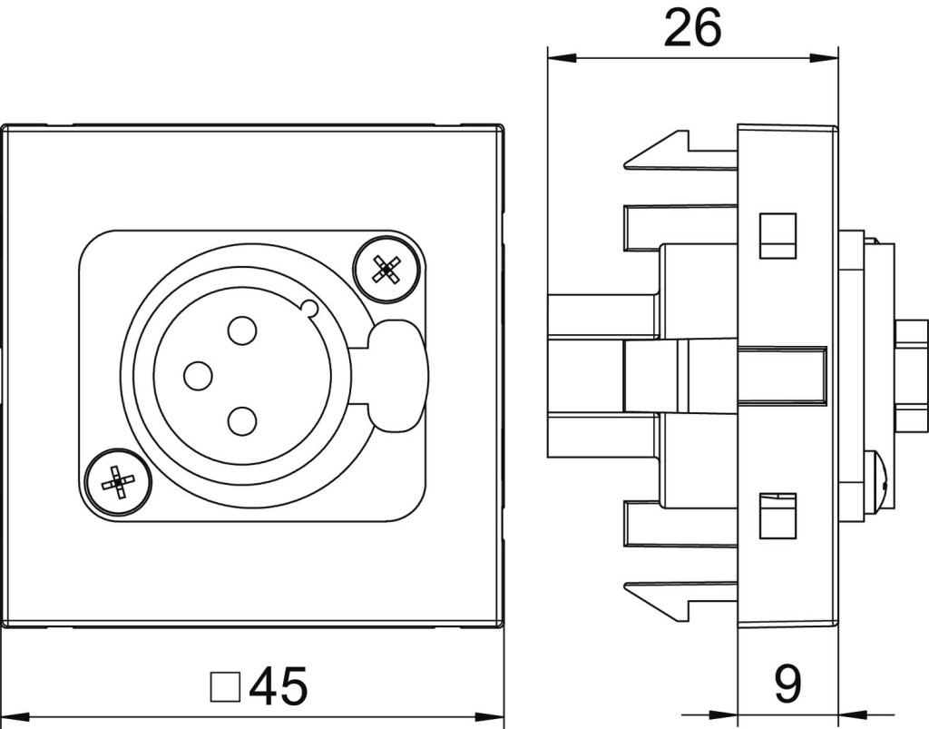 XLR csatlakozóhüvely. A bepattinható rögzítés normál és 90 fokkal elforgatott beépítést is