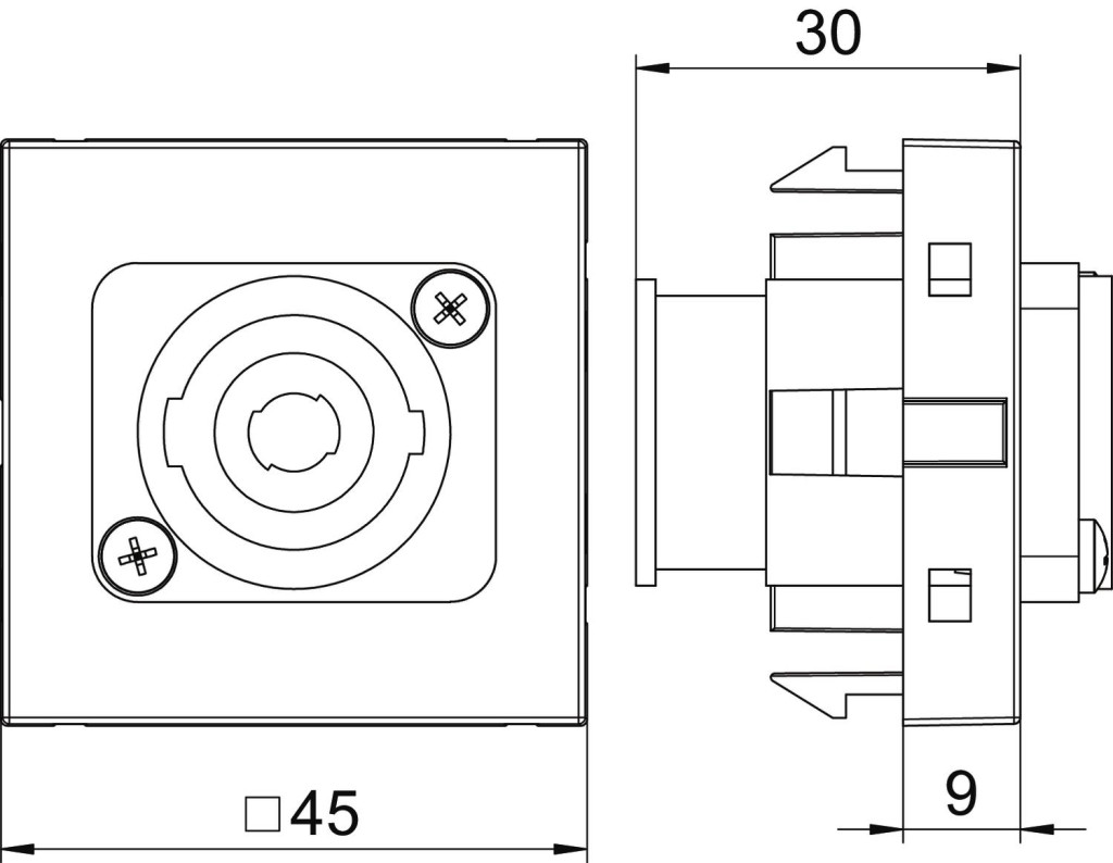 Multimédia tartó SpeakON csatlakozóhüvellyel, egyenes kivitel felirati mező nélkül, 4 pólusú csavaros csatlakozással. A bepattinható rögzítés normál és 90 fokkal elforgatott beépítést is lehetővé tesz.