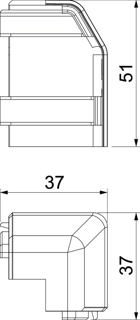Külső sarokelem idomdarabként a padlószegély csatorna irányváltásához.