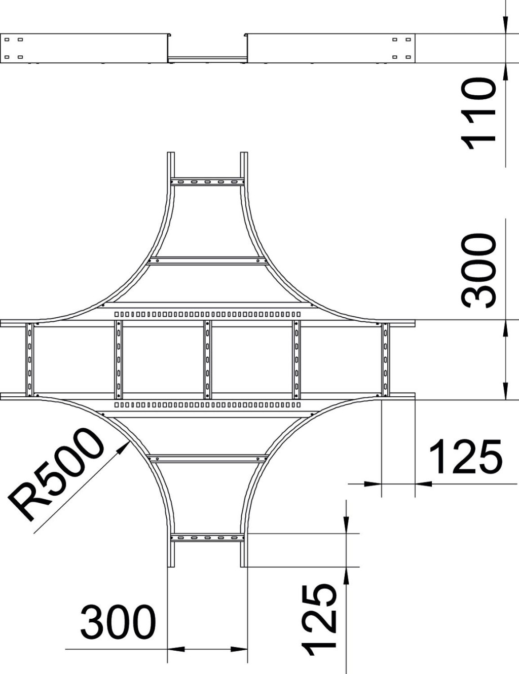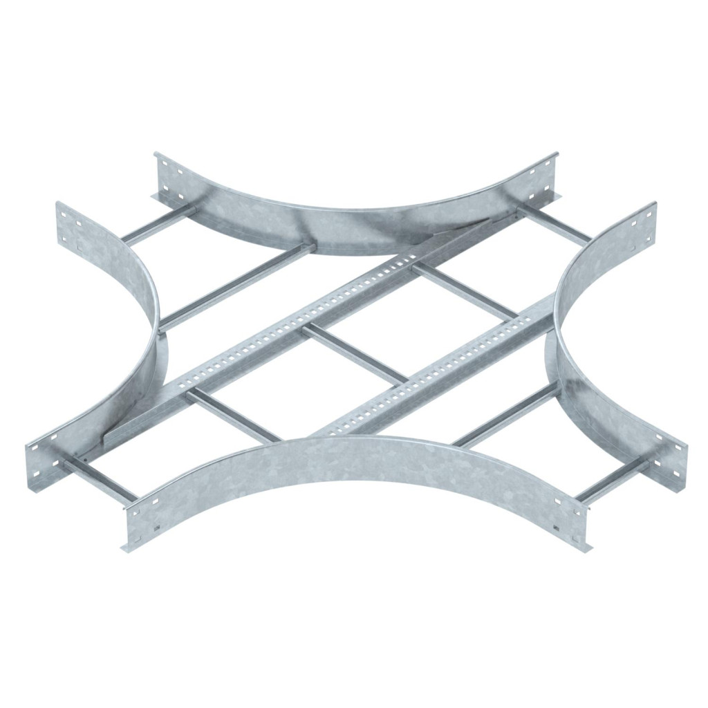 Cross-over for the creation of horizontal branches, fitting for cable ladders of side height 110 mm. With connector perforation. Can be used indoors and outdoors. Connector and fastening material must be ordered separately. Fittings must be supported by the support structure.