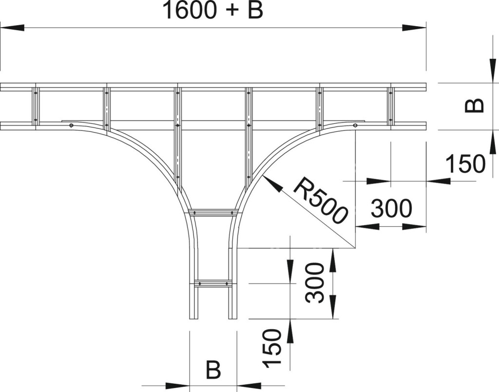 Vízszintes T-idom 110 mm oldalmagasságú nagyfesztávú kábellétrához. A nagyobb stabilitás érdekében az idomdarabok környezetében alátámasztásokat kell alkalmazni.