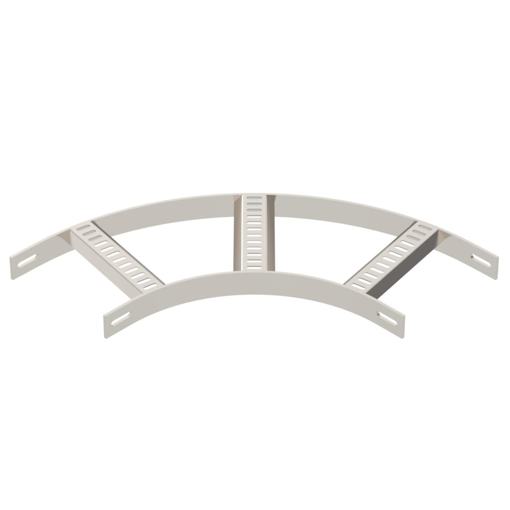 90°-os sarokidom a hajógyártásban használt, SL 62 típusú, 40 mm oldalmagasságú kábellétrához, behegesztett, lefelé nyitott, perforált trapéz-létrafokokkal.