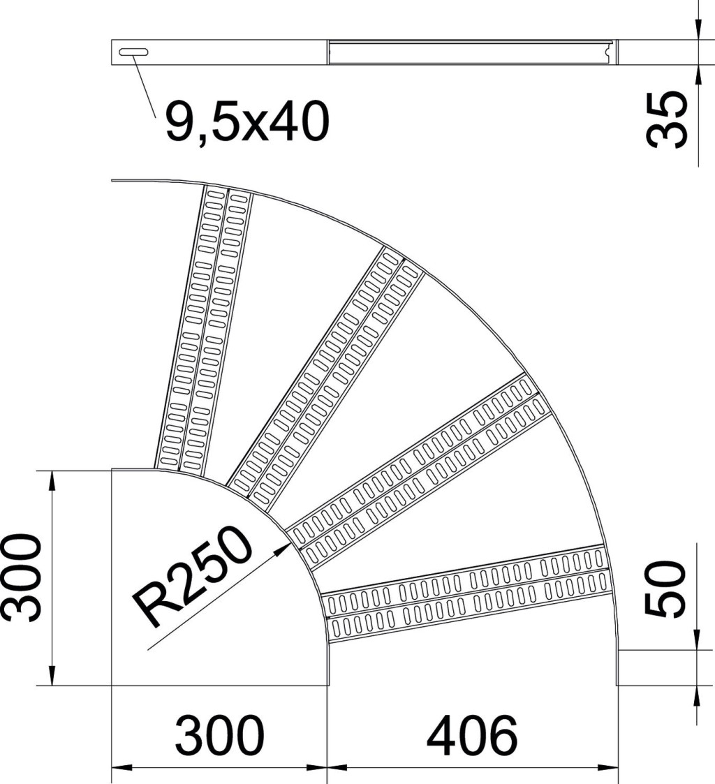 90°-os sarokidom a hajógyártásban használt, SLZ L típusú, 35 mm oldalmagasságú kábellétrához, behegesztett, perforált Z-profilokkal.