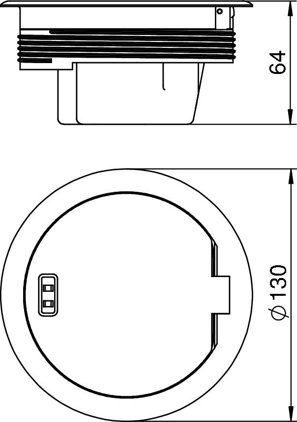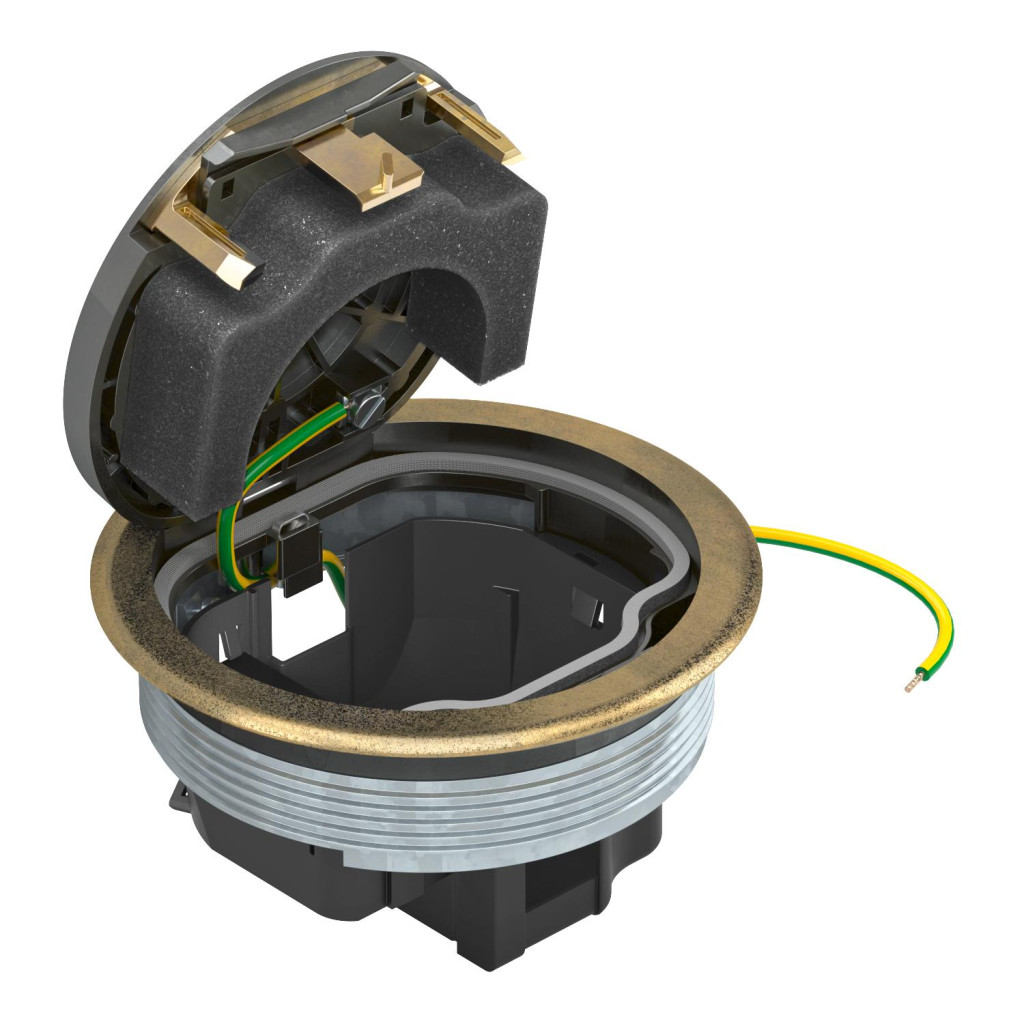 Kerek beépítőegység padlóburkolat védőkerettel UDL2-120 típusú csatlakozódobozba történő közvetlen beépítéshez. Zárt állapotban a nedves ápolást is elviseli a beépítőegység. A minimális beépítési mélység 70 mm.