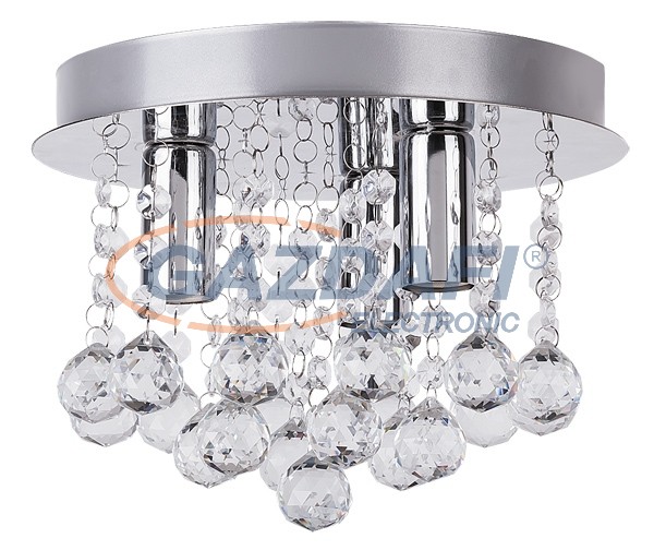 Modern megjelenésű mennyezeti lámpa 3 db foglalattal. 25 cm átmérőjű, króm színű fém test és akril kristály lámpabúra. A lámpatest E14-es foglalatkialakítású, max. 3x 40W teljesítményű energiatakarékos fényforrásokkal is használható.