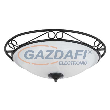 Klasszikus megjelenésű mennyezeti lámpa, 47 cm-es átmérővel, matt fekete színű, kovácsoltvas jellegű, fém szerkezettel és fehér alabástromüvegbúrával. 3 darab E27-es foglalatában maximum 60W teljesítményű, halogén vagy LED fényforrásokkal is használható.