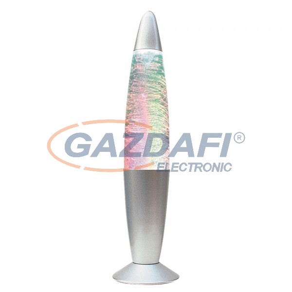 Dekor lámpa hangulatvilágítással, beépített RGB LED fényforrással, DC 5V tápegységgel és USB töltőkábellel. 33 cm magas, 9 cm átmérőjű, fém és üveg kombinációjú szerkezet. Vízzel feltöltve az RGB LED fényforrás – forgószél-effekt mellett – változó alapszínű hangulatvilágítást kínál.