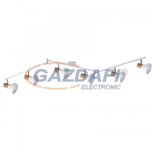 Skandináv stílusú mennyezeti spotlámpa 6 db foglalattal. 150 cm széles, fehér és bükk színkombinációjú fém lámpatest pozícionálható lámpabúrákkal, IP20-as védettséggel. A lámpatest E-14-es foglalatkialakítású, 6x max. 40W teljesítményű, energiatakarékos izzókkal is használható.