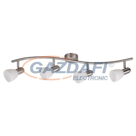 Időtlen stílusú spotlámpa, 4 darab foglalattal. 70 cm széles, szatin króm színű fém szerkezet és pozícionálható, fehér színű üvegbúrák, IP20-as védelemmel. A lámpatest E14-es foglalatú, max. 4x 40W teljesítményű, halogén vagy energiatakarékos fényforrásokkal is működtethető.