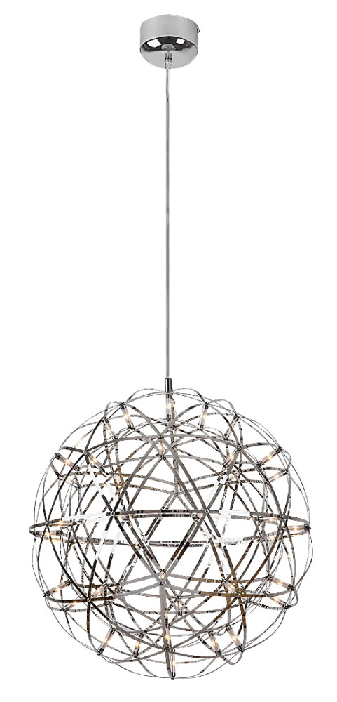 A modern stílusú, állítható Eudora függesztéket elsősorban a nappaliba vagy a hálószobába ajánljuk. A rozsdamentes acélból készült, krómszínű lámpa rácsos búrájának anyaga fém, a lámpa kisméretű, kerek dísztalp segítségével rögzíthető a mennyezetre. Ez a csillogó modell leginkább egy hatalmas karácsonyi gömbre emlékeztet, amely fényével és ragyogó megjelenésével ünneppé varázsolja estéinket. Az Eudora a G energiaosztályba tartozó beépített LED fényforrással rendelkezik, amelynek teljesítménye 12 W, fényereje búrával 650 lumen, búra nélkül 780 lumen, élettartama pedig kiemelkedően magas: 36 000 óra! A 3000 K színhőmérsékletű fényforrás meleg fehér fényt sugároz, amely elősegíti a meghitt, otthonos hangulat megteremtését, pihenteti a szemet, és ideális a lazításhoz, kikapcsolódáshoz. Az Eudora függő lámpa méretei a következők: átmérője 500 mm, beépítési átmérője 110 mm, belógása 1000–1500 mm között állítható.