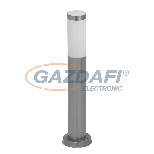 Modern megjelenésű kültéri állólámpa UV sugárzásnak ellenálló kivitelben. 45 cm magas, 11 cm átmérőjű, rozsdamentes acél színű fém lámpatest és fehér színű műanyag lámpabúra, IP44-es, azaz fröccsenő víz és por elleni védelemmel. A lámpatest E27-es foglalatú, max. 25W teljesítményű energiatakarékos fényforrással is használható.