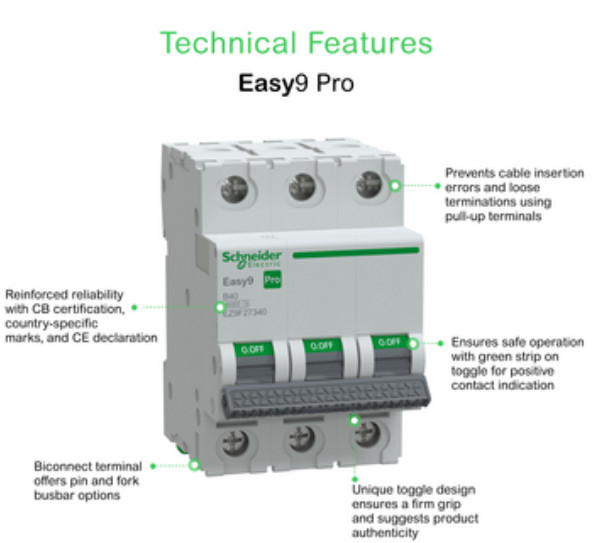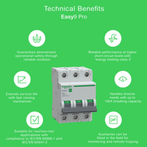 Az Easy9 Pro, az Easy9 család legújabb tagja, a legmagasabb szintű elektromos védelmet nyújtja, miközben megfelel a különböző projektek követelményeinek. Ideális lakossági környezetben, valamint kis- és közepes kereskedelmi épületekhez (pl. éttermek, gyógyszertárak, élelmiszerboltok, kiskereskedelmi üzletek).