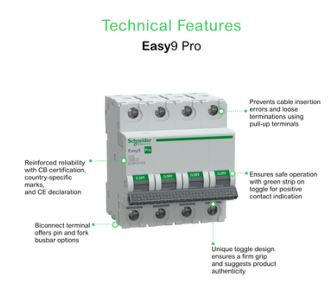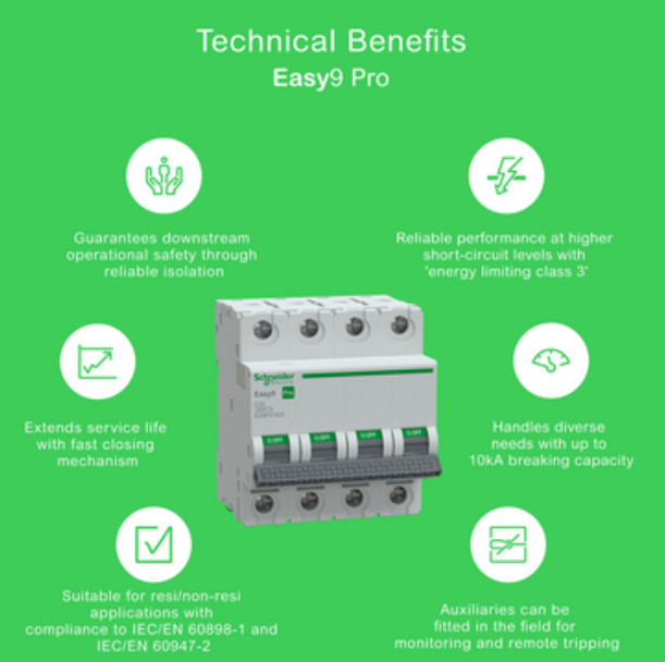 Az Easy9 Pro, az Easy9 család legújabb tagja, a legmagasabb szintű elektromos védelmet nyújtja, miközben megfelel a különböző projektek követelményeinek. Ideális lakossági környezetben, valamint kis- és közepes kereskedelmi épületekhez (pl. éttermek, gyógyszertárak, élelmiszerboltok, kiskereskedelmi üzletek).