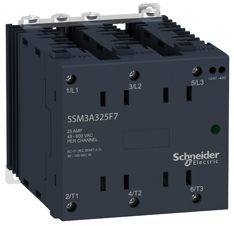 SCHNEIDER SSM3A325BD SSM szilárdtestrelé, 3f, nullfeszültségű kapcsolás, 3NO, 48-600VAC, 25A, 24VDC