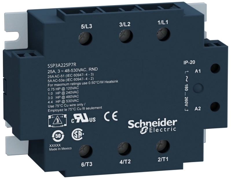 SCHNEIDER SSP3A225P7T SSP szilárdtestrelé, panelre szerelhető, 3f, nullfesz kapcs, 3NO, 48…530 VAC, 25A, 230 VAC
