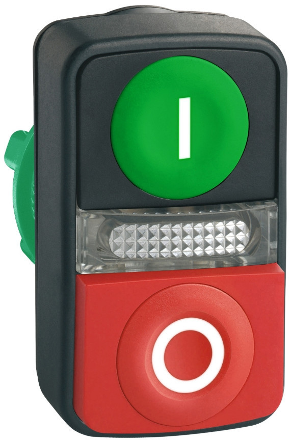 Harmony műanyag világító kettősfejű nyomógomb fej, Ø22, visszatérő, 1 zöld "I", 1 kiálló piros "O" nyomógomb