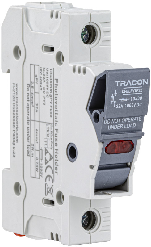 TRACON CFBLPV1P32 Szakaszolókapcsoló-biztosító hengeres bizt.hoz, PV 32A, 10×38, Un=1000VDC, Ui=6kV, 20kA, DC-PV0, IP20, 1P, LED