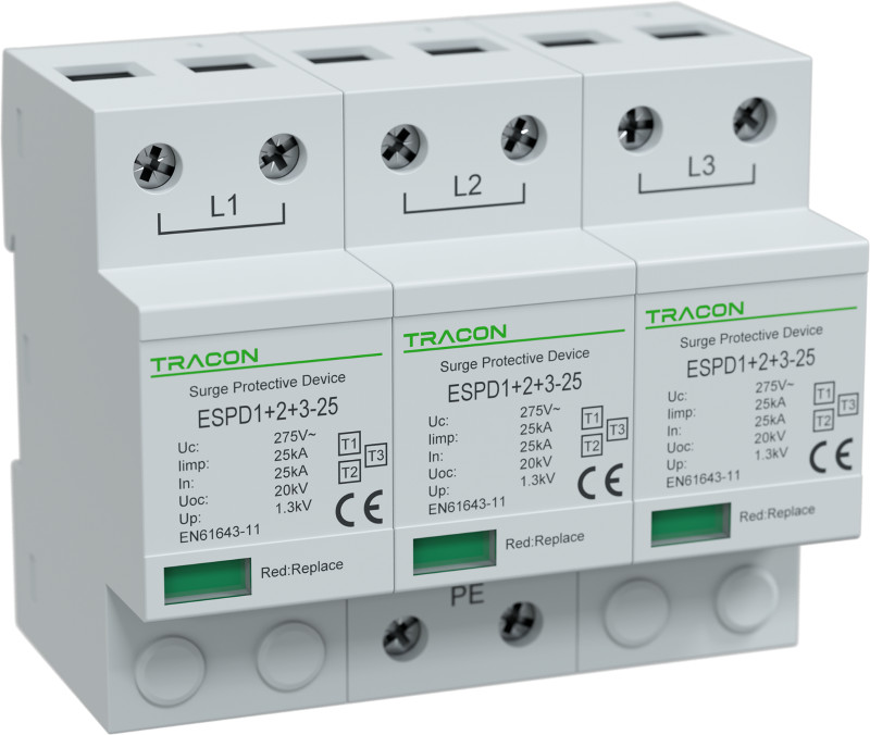 TRACON ESPD1+2+3-25-3P T1+T2+T3 AC típusú túlfeszültség levezető, egybeépített Uc:275V; Iimp:25kA; In:25kA; Uoc:20kV; Up:1,3kV; 3P