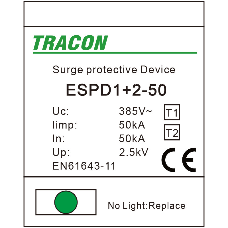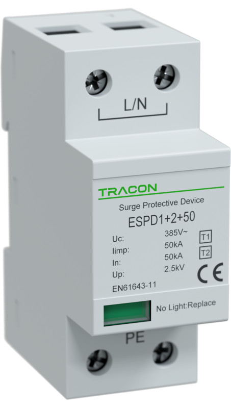 TRACON ESPD1+2-50-1P T1+T2 AC típusú túlfeszültséglevezető, egybeépített Uc:385V; Iimp:50kA; In:50kA; Imax:160kA; Up:2,5kV; 1P