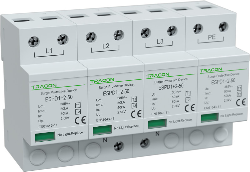 TRACON ESPD1+2-50-4P T1+T2 AC típusú túlfeszültséglevezető, egybeépített Uc:385V; Iimp:50kA; In:50kA; Imax:160kA; Up:2,5kV; 4P