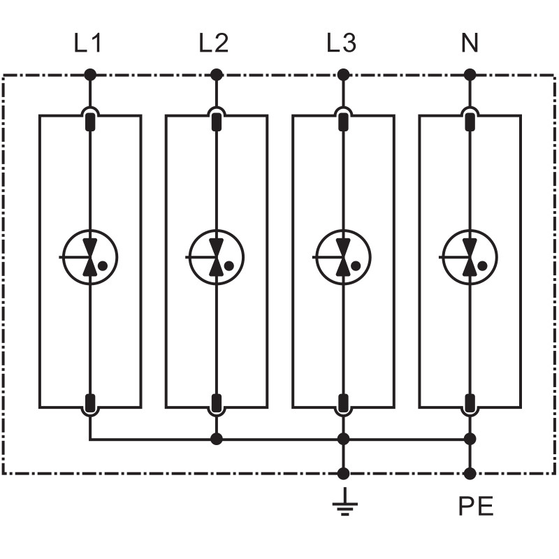 Védelmi szint < 4 kV, a beépítés szokásos helye: főelosztó - T2 típus: túlfeszültség-levezetők