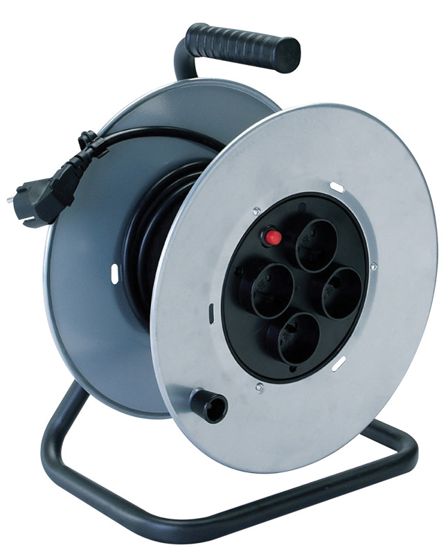 TRACON KD-4/40-B Kábeldobos hosszabbító, fémvázzal 4×SCHUKO, 40m, 250V AC, 16A, 3×1,5mm2, H05VV-F, IP20 általános leírása: