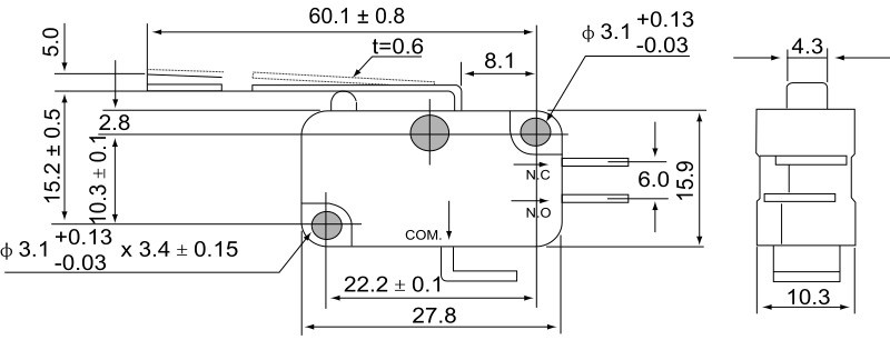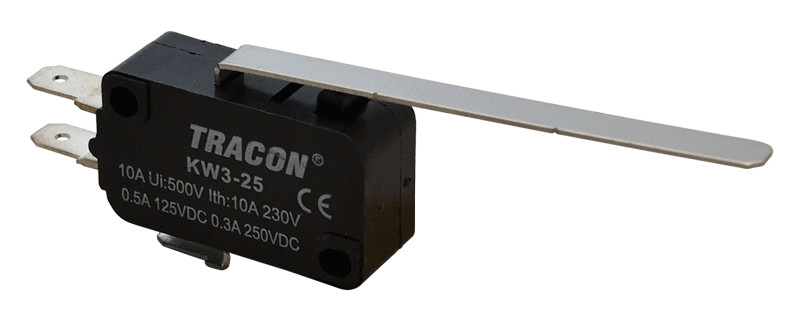 TRACON KW3-25 Helyzetkapcsoló, mikro, rugószáras 1×CO 10A/230VAC, 0,3A/250VDC, 52mm, 4,8x0,5 mm, IP00