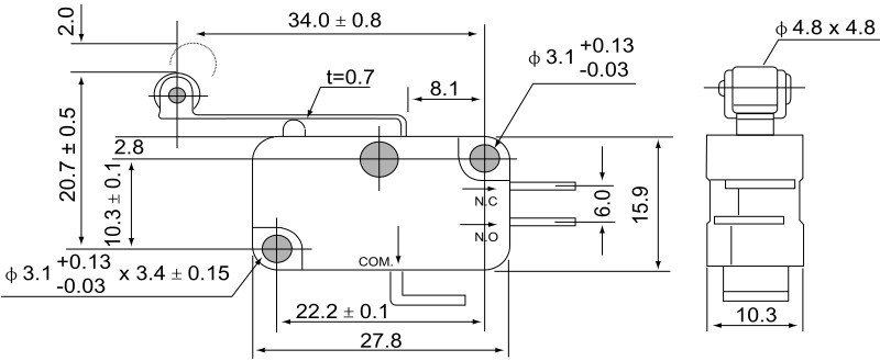 TRACON KW3-51 Helyzetkapcsoló, mikro, karos-görgős 1×CO 10A/230VAC, 0,3A/250VDC, 28mm, 6,3x0,8 mm, IP00