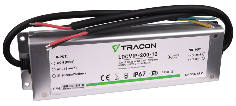 TRACON LDCVIP-200-12 Védett fém házas LED meghajtó 90-264VAC/12VDC,200W,0-16,5A, IP67