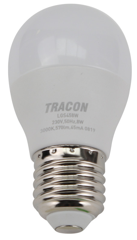 TRACON LGS458W Gömb burájú LED fényforrás SAMSUNG chippel 230V,50Hz,8W,3000K,E27,710lm,180°,G45,SAMSUNG chip, EEI=F