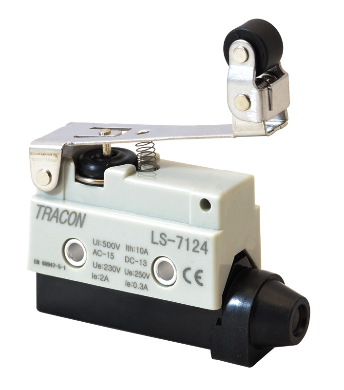 TRACON LS7124 Helyzetkapcsoló, rugószáras-csuklógörgő 1xCO,2A/230V AC-15, 0,3A/250V DC-13, 65mm, IP40